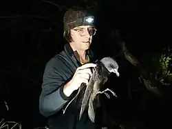 ![]() Russell tagging a grey-faced petrel in 2016 | |