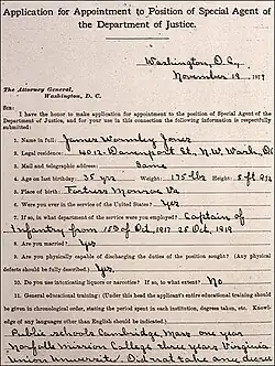 Jones was appointed as the first African-American special agent on November 19, 1919, by Bureau of Investigation director A. Bruce Bielaski. Jones was assigned to a new section of the Justice Department created to track the activities of groups perceived as subversive. His work there was under the direct supervision of J. Edgar Hoover.