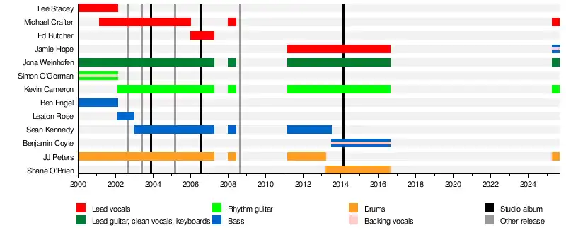 The band initially split up in April 2007 due to the inability to find a permanent vocalist. They reformed with vocalist Michael Crafter to play a farewell tour in mid-2008 and released a live album and DVD, Sleepless Nights and City Lights, which peaked at #48 in Australia.[1] In May 2011 the band reformed with new vocalist Jamie Hope and performed on the Destroy Music Tour. They subsequently released their third studio album Beloved in February 2014.