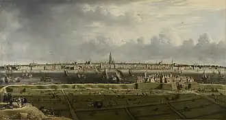 He painted at least 4 views of Antwerp.[3] The view dated 1658 was ordered for the Antwerp City Hall.[1] He also made views of Amsterdam and Brussels. These views all show the cities from a distance and with a bird's eye perspective. Bonnecroy relied on drawings of the principal buildings and city maps and his knowledge of perspective to create this illusion of looking at the cities from above.[4] The View of Brussels now part of the collection of the Royal Museums of Fine Arts of Belgium was originally the property of the Dukes of Arenberg who kept it in their castle in Heverlee.[5]