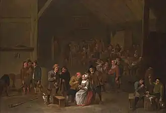 Jan Baptist Nollekens is mainly known for his genre scenes of peasants in interiors and merry companies. He showed the peasants in taverns, kitchen interiors, barns or outside. The peasants are depicted playing cards, drinking, smoking and engaged in courtship or conversation, He also painted an Artist and patrons in a studio.[6] His genre paintings appear influenced by those of Adriaen Brouwer and David Teniers the Younger.