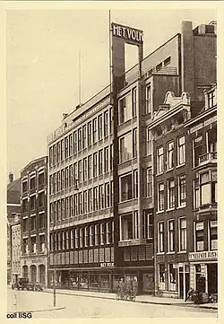 This headquarters building for the socialist De Arbeiderspers (The Worker's Press) (1929–31) is in New Objectivist style. The managing director of the company pronounced it "a building of truly impressive beauty" partly because the façade "in accordance with the stated requirements ... has no 'ornamentation' other than an extension to be used for advertising. This façade has no other pretension than being the front of a building in which work is done".[17] However, the Amsterdam Beauty Commission objected to the building on stylistic grounds.[2] It was Buijs' favourite of his works, perhaps because in it he was able to explicitly articulate his viewpoint as a socialist architect by building a "cathedral of labour".[2] The building, known as 'the red fortress', was demolished in 1972.[18]