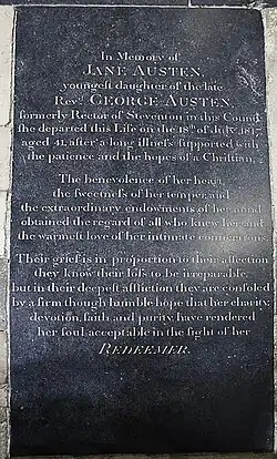 Austen died in Winchester on 18 July 1817 at the age of 41. Henry, through his clerical connections, arranged for his sister to be buried in the north aisle of the nave of Winchester Cathedral. The epitaph composed by her brother James praises Austen's personal qualities, expresses hope for her salvation, and mentions the "extraordinary endowments of her mind", but does not explicitly mention her achievements as a writer.[124]