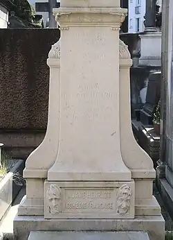 A year after her death on 8 March 1901, a memorial service was held in Saint-Roch, Paris,[4] where her friends went to her tomb which was sculpted by Denys Puech above a white marble monument by the architect Marcel Dourgnon with the following words having been engraved on the base of the tomb: "À Jane Henriot, la Comédie-Française" (English: To Jane Henriot, the French-Comedy),[4] with an inscription taken from an article by Émile Faguet: ...Elle est venue, Elle a souri, Elle a passé! (English: She came, She smiled, She has passed!)[4]