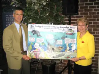 Lubchenco helped craft the United States' National Ocean Policy, a document that provides a science-based blueprint for managing the U.S.'s oceans, coasts and Great Lakes to help mitigate conflicts between different ocean users (fishermen, shippers, natural resource managers, etc.) and ensure an overarching focus on good stewardship. She actively participated in the President's Interagency Ocean Policy Task Force and attended all of the six regional meetings across the country to gather stakeholder input. Recommendations of this Task Force were adopted by President Obama as the nation's first formal policy on oceans on July 19, 2010.[46][47] While environmental groups, federal and state lawmakers, and federal agency officials applauded the policy, some lawmakers and members of industry felt that it would provide too much regulation. Despite some opposition, on April 16, 2013, the Obama administration laid out an implementation plan for the National Ocean Policy to put into practice the recommendations laid out in the policy.[48][49][50] Since that time, the Northeast and Mid-Atlantic Regional Planning Bodies have completed new Regional Ocean Plans (Northeast Plan, Mid-Atlantic Plan) for which they were awarded the 2017 Excellence in Solutions Peter Benchley Ocean Award.