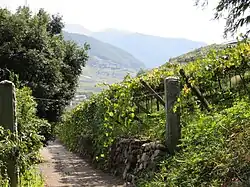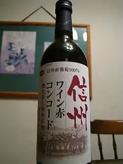 A report written in 1869 by Adams, Secretary to the British Legation in Yedo, describes "a quantity of vines, trained on horizontal trellis frames, which rested on poles at a height of 7 or 8 feet from the ground" in the region of Koshu, Yamanashi.[6] It was not until 1873 however, after detailed reports on European wine culture were made available by returning members of the Iwakura Mission, that more focused attempts were made to promote domestic wine production. The first attempt to produce wine locally, using mainly sake brewing equipment, was undertaken by Hironori Yamada and Norihisa Takuma in Kofu, Yamanashi, in 1875.[2] In 1877, the newly formed winery Dai-Nihon Yamanashi Budoshu in Katsunuma, Yamanashi dispatched Masanari Takano and Ryuken Tsuchiya to Troyes in the Champagne region of France to learn viticulture and wine production techniques.[7][8] The cultivation of European grape varieties formed the core of early Japanese attempts, however the project was all but destroyed in 1884 by an outbreak of Phylloxera that arrived via imported root stock.[9]