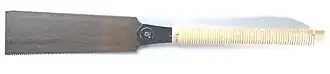 - Japanese saw (鋸, nokogiri), which cuts on the pull stroke, rather than the otherwise globally prevalent push stroke. This allows the blades to be quite thin in comparison to the Western saw. There are two main kinds of cutting teeth on Japanese saws: crosscut (横挽き, yokobiki) and rip (縦挽き, tatebiki). The rip and crosscut are combined in one blade, known as a ryoba (両刃; lit. 'dual edge'). The rip and crosscut patterns are also made in single-edged saws, kataha nokogiri (片刃), both with stiffening back pieces and without. The stiff-backed saws, known as douzuki (胴付き; lit. 'attached trunk') are typically used in cutting fine joinery. There are many other types of Japanese saws as well: osae-biki (押さえ引き鋸; lit. 'press-cut saw'), used for flush-cutting pegs to a surface without marring the surface. The saw teeth have no set to one or both sides to accomplish this feat.[5] There is the azebiki (畔挽き; lit. 'ridge saw'), which has cutting both rip and crosscut teeth, and is short and rounded in profile. It is used for sawing in confined areas and starting cuts in the middle of surfaces. There are many other types and sub-types of saw. Most saws sold in the West are mass-produced items with induction-hardened teeth and relatively cheap replaceable blades. The handmade forged saws are very laborious to make and involve more manufacturing steps in the forging to complete than planes or chisels.[2]