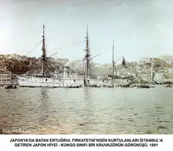 During 1880, Hiei visited ports in India, Persia, the Persian Gulf and various ports in Southeast Asia. The ship made annual port visits to Jinsen in Korea in 1881 through 1883. She was assigned to the Small Standing Fleet in 1886 and became a training ship in 1887 the following year. Together with her sister ship Kongō, Hiei sailed from Shinagawa, Tokyo on 13 August 1889 on a training cruise to the Mediterranean with cadets from the Imperial Japanese Naval Academy, returning on 2 February 1890. On 5 October the sisters departed Shinagawa for Kobe to pick up the 69 survivors of the wrecked Ottoman frigate Ertuğrul and continued on to Istanbul, Turkey to return them to their homeland.[13] They arrived on 2 January 1891, and the ships' officers were received by Sultan Abdul Hamid II. The ships also carried a class of naval cadets. On the return voyage, they made a port visit at Piraeus where they were visited by King George I of Greece and his son, Crown Prince Constantine. Making stops at Alexandria, Port Said, Aden, Colombo, Singapore and Hong Kong, the sisters arrived at Shinagawa on 10 May.[13]