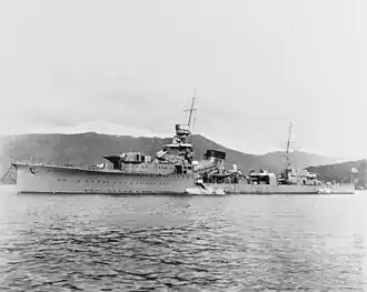 Yūbari, named after the Yūbari River,[9] was laid down on 5 June 1922 at the Sasebo Naval Arsenal, launched on 5 March 1923 and completed, and commissioned on 31 July 1923,[10] under the command of Captain Masao Sugiura. Completed just prior to the 1923 Great Kantō earthquake on 1 September, Yūbari was quickly pressed into service to help evacuate refugees from the Shinagawa area. Crown Prince Hirohito boarded the vessel for a tour from Yokohama to Yokosuka on 10 October. The ship was transferred to the 3rd Cruiser Division of the 1st Fleet on 1 December and Masao was replaced by Captain Yamaguchi Nobuichi.[8] Accompanied by the light cruisers Tama and Isuzu, Yūbari cruised off the Chinese coast in March 1924. After serving as the flagship for a destroyer squadron during the annual fleet maneuvers in late 1924, she was placed in reserve on 1 December.[11]