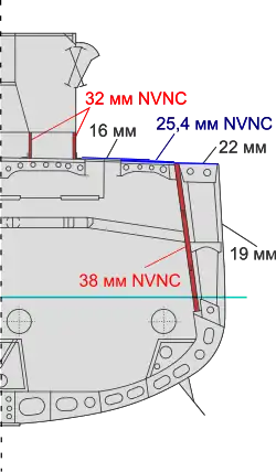 Yūbari's armor was designed to protect against American 4-inch (102 mm) shells and the cruiser was equipped with an internal waterline 38-millimeter (1.5 in) New Vickers Non-Cemented (NVNC) armor belt that sloped outwards 10° from top to bottom. The belt was 4.15 meters (13 ft 7 in) high, had a length of 57.91 meters (190 ft), and connected to the armored deck at the top and the double bottom below. Forming the top of the armored citadel, the deck had 25.4-millimeter-thick (1 in) NVNC armor plates that were reinforced by 22-millimeter (0.87 in) plates of high-tensile steel along the centerline. The boiler uptakes were protected up to a height of 0.76 meters (2 ft 6 in) by NVNC plates 32 millimeters (1.3 in) thick.[2]