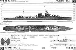 The cruiser's main battery consisted of six 50-caliber 14-centimeter (5.5 in) 3rd Year Type guns arranged in two twin-gun turrets and two single gun mounts protected by gun shields. One mount of each type was positioned forward and aft of the superstructure in a superfiring arrangement with the single mount positioned below the twin-gun turret. A pair of rotating Type 8 twin-tube mounts for 61-centimeter (24 in) torpedoes were located amidships on the ship's centerline. Each tube was provided with a single reload torpedo. A single 40-caliber 76-millimeter (3 in) 3rd Year Type anti-aircraft (AA) gun and two 7.7-millimeter (0.30 in) Lewis machine guns on a raised platform between the torpedo mounts for anti-aircraft defense. Yūbari was fitted with six rails at the stern that could accommodate 48 No. 1 naval mines in 24 compartments in the hull.[4]
