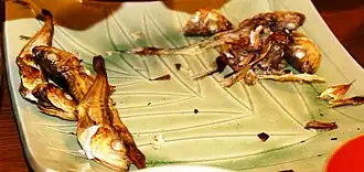 As a food source, the fish has mostly been sourced locally from the coastal region of the Sea of Japan, and has been designated the official prefectural fish of Akita Prefecture.[5] The fish, which is scaleless, may be prepared whole as braised or grilled fish, and has a mucilaginous consistency.[6] It is also dried to make stockfish; salted, dried, and made into himono; and cured in miso as misozuke. It is the main ingredient of the fish sauce called shottsuru.[7] The egg masses are known as burikko.[7] In Korean the fish is called 도루묵 dorumuk.[1]