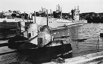 ![]() Ha-102 (center) with Ha-101 (left) and Ha-104 (right) at Yokosuka, Japan, in 1945. Three midget submarines are in the foreground. | |