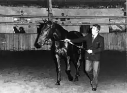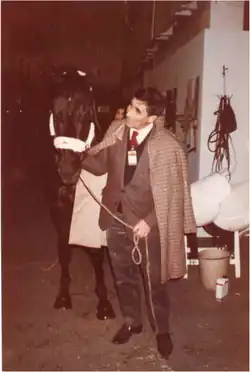 He was bred and made famous by Henry Delage, who had initially intended him for jump racing. However, the young rider Françoise Terrier-Thuault "begged" the breeder to keep him for show jumping, a discipline which revealed Jappeloup's aptitudes for jumping.[3] Henry Delage introduced 4-year-old Jappeloup to Pierre Durand who first refused to try him, claiming he was "too small". The horse showed great ease despite his modest height, but Jappeloup was so small that it could have prevented him from competing internationally. One year later, Pierre Durand reconsidered his decision after seeing Jappeloup jump: the horse had a temper and was disobedient but had incredible jumping capacities.[4] He immediately got in touch with the breeder and Jappeloup never left him ever since.[5] Over the course of his career, he was sponsored by the house "De Luze", which is why his name was changed into Jappeloup de Luze.[6]