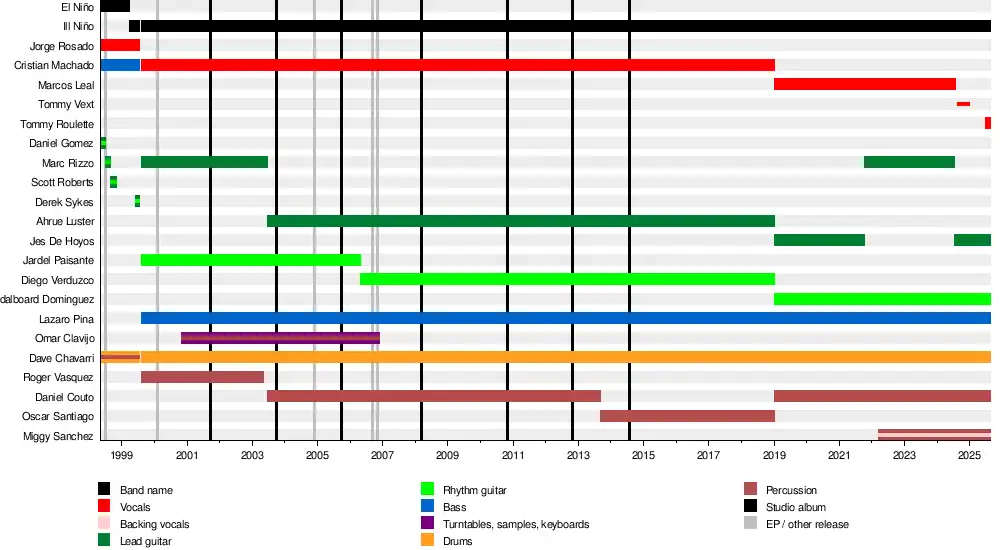 Ill Niño (Spanish for "ill child"; stylized as ill niño) is a Latin American nu metal band formed in Union City, New Jersey, in 1998 by drummer Dave Chavarri, who remains the band's sole original member. They have released seven studio albums, two EPs, and one compilation album, with total worldwide album sales exceeding 1.3 million.[1]