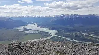 Jasper Lake is in the Rocky Mountains of Jasper National Park in Alberta, Canada. It is part of the Athabasca River, where the river broadens out. Its westernmost shore lies about 24 kilometres (15 mi) northeast from the town of Jasper along the Yellowhead Highway (Highway 16) and stretches farther east for about 9.7 km (6 mi).