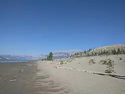 The Canadian National Railway skirts the northwestern shore of the lake. Parts it have been built on causeways away from the shore, which have created several ponds. Via Rail's passenger train the Canadian uses this same CN line for part of its journey between Toronto and Vancouver, giving passengers up-close views of the lake, sand dunes, and surrounding mountains. This area has been the site of many CN publicity photographs—including of the Super Continental[4][5]—through the years, and it is still popular with photographers, railfans, advertisers, and passengers.