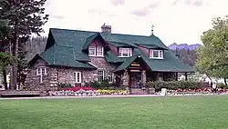 Jasper Park Lodge, is situated east of the town, across the Athabasca River on Lac Beauvert. This was one of the earliest tourist developments in the park, with the main lodge built in 1921.[94] It has amenities such as private cabins, an 18-hole golf course, spa, and restaurants. In 2024, the Jasper Wildfire damaged some of the property, but most visitor offerings reopened that fall.[95][96]