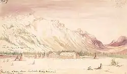 Shortly before reaching the pass, De Smet met Lieutenants Henry James Warre and Mervin Vavasour who had been spying for the British in the Oregon Country and were returning east with a Hudson's Bay Company brigade and 15 Indigenous porters. Now over the pass, Warre and company traded their snowshoes for horses and continued down to Jasper House.[27] Warre sketched the Whirlpool River Valley and Jasper House; the latter showing the post's log buildings and many tipis of Indigenous families.[28]