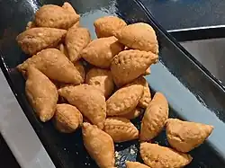 Yau gok (油角) or jau gok (油角) is a traditional pastry found in Cantonese cuisine, originating from Guangdong Province in China. The term gok (角) reflects the crescent shape of the pastries;[1] they differ from the connotation of steamed or pan-fried Chinese dumplings, normally associated with the phonetically similar term jiaozi (餃仔). They are most commonly prepared during Chinese New Year, and consumed in Cantonese-speaking regions and communities, including Hong Kong and Malaysia.[2]