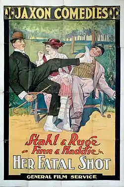 From 1916 to 1918, the company released at least 78 comedy shorts. They were marketed as Jaxon Comedies. Billy Ruge was one of the actors who appeared in the company's films as well as Walter Stull, Bobby Burns, and Kate Price. The studio's performers were "poached" from the Vim Comedy Company.[1] The studio released the 12 part serial A Daughter of Uncle Sam in 1918 directed by James C. Morton.