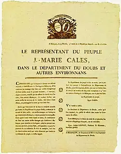 In this mission, he developed much « prudence and firmness ».[35] He succeeded, not without difficulty, in putting an end to the revolutionary excesses committed by the "terrorists" (supporters of the regime of the Terror) and closed the club of Dijon (Terror is no longer on the agenda! he said[35]) which had asked the Convention on 7 Fructidor (24 August 1794) for the return of rigorous measures, as before under the Terror. Calès freed about 300 incarcerated prisoners, and the political purge was led in the opposite direction.[35] All the local popular societies became prohibited and were dissolved.[36] Conversely, he attempted to prevent the return of the royalists and other fanatic Catholics, who took advantage of the liberalism of the thermidorian reaction to install in turn a violent reign of white terror, by threatening by decree[37] the nonjuring priests (« prêtres réfractaires », except married, sixty-year-old or invalid priests) that their bells would be broken, as well as their crosses and pedestals, and that the celebration of the cult would be forbidden.[38] The National Convention, after having heard the glowing reports of the Committee of Public Safety (made by Boissy d'Anglas) and of the Committee of General Security which were both approving the « firm and energetic » conduct of Calès in the Côte d'Or,[39][40] decreed the 5 nivôse year III (25 December 1794) that he will go immediately to Besançon, in the department of Doubs.