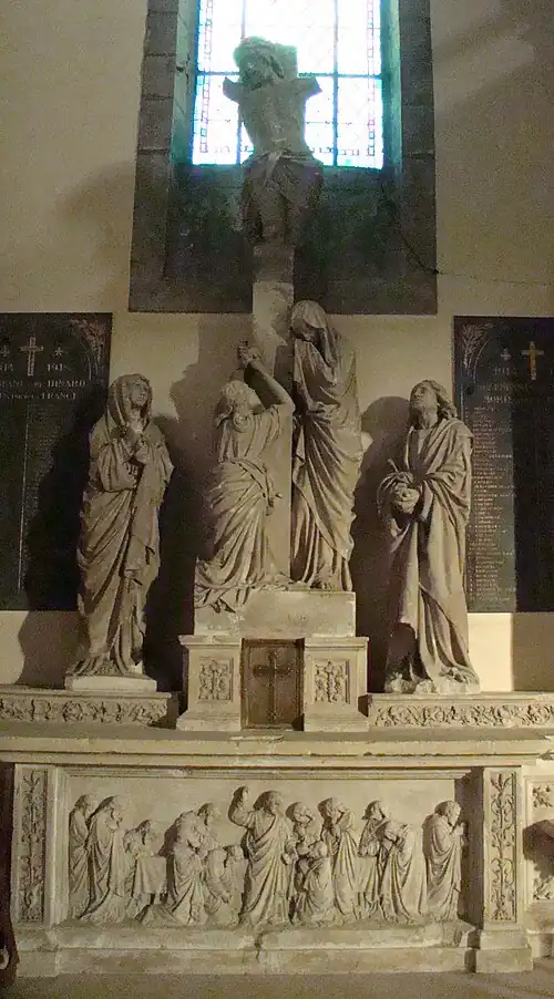 For this church in Montreuil-le-Gast, Valentin executed a limestone altarpiece for the main altar. It comprised a cavalry with angels placed on either side. The work dates to 1861.[8][9] [10] For the same church, Valentin created the altarpiece for the main altar.[11]