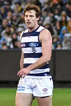 Jed Bews (born 14 December 1993) is an Australian rules footballer for the Geelong Football Club in the Australian Football League (AFL). He was drafted with the 86th pick in the 2011 AFL Draft[1] under the father–son rule.[2][3][4][5] His father, Andrew Bews, also played for Geelong, wearing the number 27. Jed was offered that number but decided against it, and was given number 24.[6] Jed made his AFL debut in round 9 of the 2014 season against Fremantle.[7] He has played primarily as a defender, standing 186 cm tall and weighing in at 88 kg.[8][9]