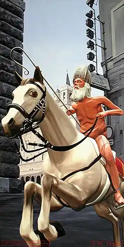 In 2004, a minor scandal surrounded a banner he had painted at the invitation of the town of Foligno for a historical pageant depicting the patron saint San Feliciano naked on horseback.[3]
