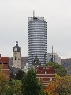 Further unofficial names include Phallus Jenensis, Cookie Roll (Keksrolle), University Tower (Uniturm) or the Henselmann tower, after the architect Hermann Henselmann. Often it is just called the tower.
