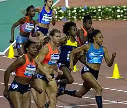 ![]() Women 200 metres at 2015 Memorial Van Damme, Brussels: Candyce McGrone, Dafne Schippers, Elaine Thompson, Jeneba Tarmoh, Allyson Felix, Cynthia Bolingo and Jodie Williams. | ||||||||||||||||||||||||||||||||||||||||||||||||