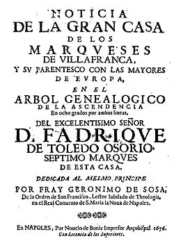 - SOSA, Fray Jerónimo de, Noticia de la Gran Casa de los Marqueses de Villafranca, y su parentesco con las mayores de Europa, Novelo de Bonis, impresor arzobispal de Nápoles, 1676 (facsimile edition).