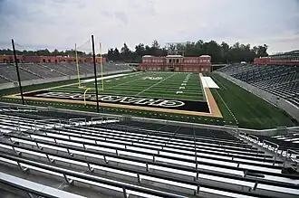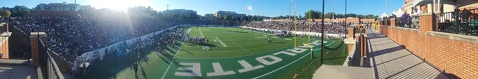 Four days after the venue passed inspection, the team hosted an informal scrimmage in front of approximately 1,500 spectators on November 3, 2012.[23][24] Two weeks later, 2,500 attendees watched the team's final scrimmage before its first season in 2013.[25] The inaugural Green and White Spring Game was held on April 20, 2013; the announced attendance at the game was 13,950.[26] The stadium hosted its first major event when the 2013 Charlotte 49ers football team defeated the Campbell Fighting Camels 52–7 on August 31, 2013. The announced official attendance for the game was 16,630, setting an initial standing-room record for the venue.[27][28] The first intercollegiate points scored at the facility came when linebacker Mark Hogan (who had previously been one of the first members of the Georgia State Panthers football program) returned an interception for a touchdown on the second play from scrimmage.[29] The team's third home game, a 13–40 loss to the North Carolina Central Eagles, also had an announced attendance of 16,630.[30]