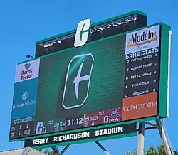 During the summer of 2023 the video score board, video ribbons, and sound systems were all upgraded. The new score board video screen covers the entirety of the available surface area at 70' by 28' for a display surface area of 1960 square feet. The new video display surface is 165% larger than the original.[4][37] New endzone video ribbons were upgraded to LED and 110' in length, while the new sound system is designed to improve clarity and definition.[38] Additional amplifiers were installed during the summer of 2024 to maximize the abilities of the sound system.[39]