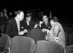 ![]() Jerry Wald (facing away from camera) during rehearsals for the 1958 Academy Awards, with John Wayne, Maurice Chevalier and Anthony Quinn | |