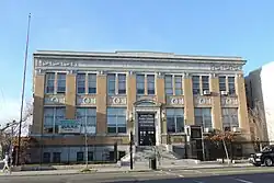 The Main Library, a four-story Renaissance Revival granite building, is located on Jersey Avenue at Montgomery and Mercer in Historic Downtown.[8][9] It is a contributing property to the state and federal Van Vorst Park historic district.[10]