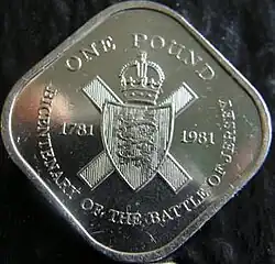 A square £1 coin was issued in circulation in 1981 to mark the bicentenary of the Battle of Jersey. The square pound could not be accepted by vending machines and was not issued after 1981.