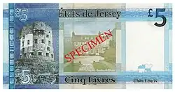 | 5 pounds | Sky blue | Queen Elizabeth II; Le Rât Cottage | Archirondel Tower; Les Augrès Manor |