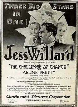 Willard parlayed his boxing fame into an acting career of a sort. He acted in a vaudeville show, had a role in Buffalo Bill's Wild West show, and starred in a 1919 feature film The Challenge of Chance.[14] In 1933, he appeared in a bit part in a boxing movie, The Prizefighter and the Lady, with Max Baer and Myrna Loy.[14]