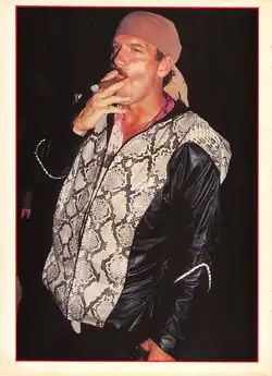 Ventura created the stage name Jesse "The Body" Ventura to go with the persona of a bully-ish beach bodybuilder, picking the name "Ventura" from a map as part of his "bleach blond from California" gimmick.[1] As a wrestler, Ventura performed as a heel. He resurrected Gorgeous George's old motto of "Win if you can, lose if you must, but always cheat!", which he emblazoned on his t-shirts. Much of this flamboyant persona was adapted from "Superstar" Billy Graham, a charismatic and popular performer during the 1970s.[1][38]