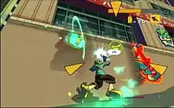 The player must search for graffiti tags left by other gangs and spray over them with their own. To do this, they first collect spray cans in each stage. Spraying is more streamlined from the last game, with manual spraying over large tags replaced by multiple spray targets depending on the tag's size.[5][2][11] Unlike Jet Set Radio, there is no time limit and spray targets can be completed at any time.[11]