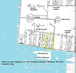 Hort's father, Abraham Hort Senior[18] saw New Zealand as a possible haven for impoverished English Jews and a potential refuge for oppressed Jews of eastern Europe and elsewhere.[19] The Jews' Hospital (Neveh zedak), which was largely funded by the Goldsmid family,[20] sponsored two Jewish women to emigrate in 1841 on the barque Birman: Elizabeth Levy, (sister of the Levy brothers), and Esther Solomon, who was being sent to marry one of the brothers.