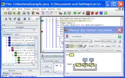 The Java/Kotlin object viewers[4][5] in jGRASP provide interface-based, structural, and other views of data structures and other objects and primitives during debugging and workbench operations. For example, a content-based view shows ArrayList and LinkedList in an identical way, as a list of elements. Structural views show the internal structure of trees, linked lists, hash tables, etc. Structural views of linked data structures display local variable nodes and their relation to the main structure. The result is animated when changes occur, as when a node is added to a linked list. Common data structures are automatically identified and displayed structurally. Other viewers show, for example, a color swatch for a Color, the image for an icon, and the binary details of a double. Multiple viewers can be combined on a single viewer canvas window and the contents can be saved to file.