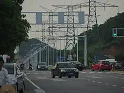 Jiangmen has a mature network of inter-city and intra-city highways and expressways, whose total length has reached 10,084.97 kilometres (6,266.51 mi) as of 2016.[25] G15 Shenyang–Haikou Expressway travels at the north, connecting downtown Jiangmen to three of its administrative divisions Heshan, Kaiping and Enping, as well as nearby cities Yangjiang, Zhongshan and Foshan. S32 Western Coastal Expressway goes along Jiangmen's coastlines, linking Zhuhai at the east and Yangjiang at the west. G94 Pearl River Delta Ring Expressway, S20 Guangzhou-Zhongshan-Jiangmen Expressway, G2518 Shenzhen-Cenxi Expressway and S47 Guangzhou-Foshan-Jiangmen-Zhuhai Expressway run through northeast Jiangmen. S49 Xinhui-Taishan Expressway connects Taishan and joints S32 at the south.
