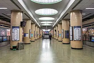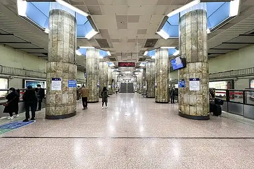 Jianguomen Station[1] (simplified Chinese: 建国门站; traditional Chinese: 建國門站; pinyin: Jiànguómén Zhàn) is an interchange station on Line 1 and Line 2 of the Beijing Subway at Jianguomen in Dongcheng District and Chaoyang District, Beijing.[2] The station handles over 170,000 transfers between Lines 1 and 2 per day.[3]