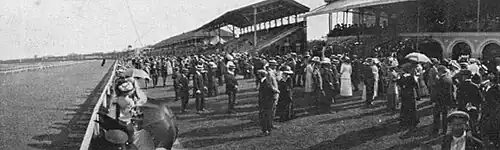 Jiangwan was opened in 1911, with a grand gala that featured a Sommer 1910 biplane flown by the French pilot René Vallon.[a][7] The first meeting was attended by more than 5,000 people, and soon members of the Shanghai Race Club were regularly in attendance.[8] The golf club opened on 30 November 1912, and by 1920 was described as Shanghai's best golf course.[9] In its inaugural races for the 1915 season, held between 16 and 18 February, the Jiangwan Racecourse featured twenty-four events with a purse ranging from $50 to $1,000.[10] Facing pressure from the new establishment, in 1911 the Shanghai Race Club began allowing the admission of Chinese nationals, albeit with limitations.[11]