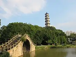 The East Pagoda was originally built in 869 or 969 and rebuilt in the following dynasties many times. Hexagon in shape, it has seven stories with the height of 28 metres (92 ft). The pagoda originally had rafters and corridors, in 1894, the British government established the British Consulate in Wenzhou near the pagoda, and forced local government to demolish the rafters and corridors.[1]