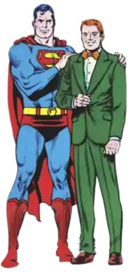 Though early adventures were relatively mundane, from issue #22 onward Superman's Pal Jimmy Olsen saw Olsen in a variety of slapstick adventures and strange transformations,[4] such as Jimmy transforming into the giant "Turtle Boy" in issue #53. The stories in the title often featured particularly outlandish situations,[12][13] ranging from Jimmy being hurled back in time to Krypton before its destruction in issue #36 to dealing frequently with gorillas of all sorts. During this period, Jimmy Olsen lived a glamorous life as "Superman's Pal" and even had his own (in-story) fan club.[14][15] Beginning in 1958, Olsen gained the ability to temporarily transform into the superhero Elastic Lad by drinking a serum, becoming an honorary member of the Legion of Super-Heroes. When traveling to the Bottle City of Kandor, Superman and Jimmy donned the secret identities of Nightwing and Flamebird, respectively. He was promoted by editor Perry White to the status of "full-fledged reporter" in issue #124 (October 1969).