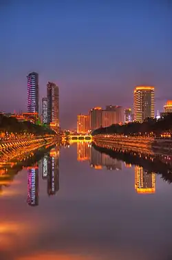 The Jin River (Chinese: 锦江; pinyin: Jǐn Jiāng) is a river of Sichuan, China. It flows through the provincial capital of Chengdu.[1] It consists of three parts: the Fu River, an extension of the Fu River (Chinese: 府河) and the Nan River(Chinese: 南河).[1] The Jin River has a long and complex cultural history, dating back to 256 BC when it was formed.[2] Over the course of several dynasties, the Jin River has been given different names by the ruler in power at the time.[3] Flowing the provincial capital of Chengdu city, the river historically provided a source for irrigation, boat travel, and a means to dispose of wastewater.[3][4][5][1] As the cities’ population increased, pollution of the river became a major environmental concern leading to regulation projects beginning in 1993.[6] The current ecological state of the river is degraded as it is overloaded with dissolved nitrogen and phosphorus inputs from urban sources.[7] Alongside the riverbank of the Jin River, theme parks were built and numerous tourism programs were created.[8]