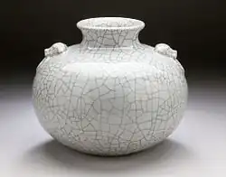 A wide variety of wares were produced for the court, with blue and white (initially ignored by the court but acceptable by 1402) accompanied by red and white wares using a copper-based underglaze red. This was sometimes combined with the cobalt blue in blue and red pieces.[20] Under the Xuande Emperor (r. 1426–1435) a copper-red monochrome glaze was used for ceremonial wares, of which very few survive. These ceased to be produced after his death, and have never been perfectly imitated, despite later attempts. This suggests the close personal interest some emperors took in the imperial potteries, and also that some secrets must have been restricted to a small group of potters.[21] The Ru ware of the Song dynasty had a similar pattern. In this reign enamel or overglaze decoration was developed, which was to dominate the finer wares in future centuries.[22]